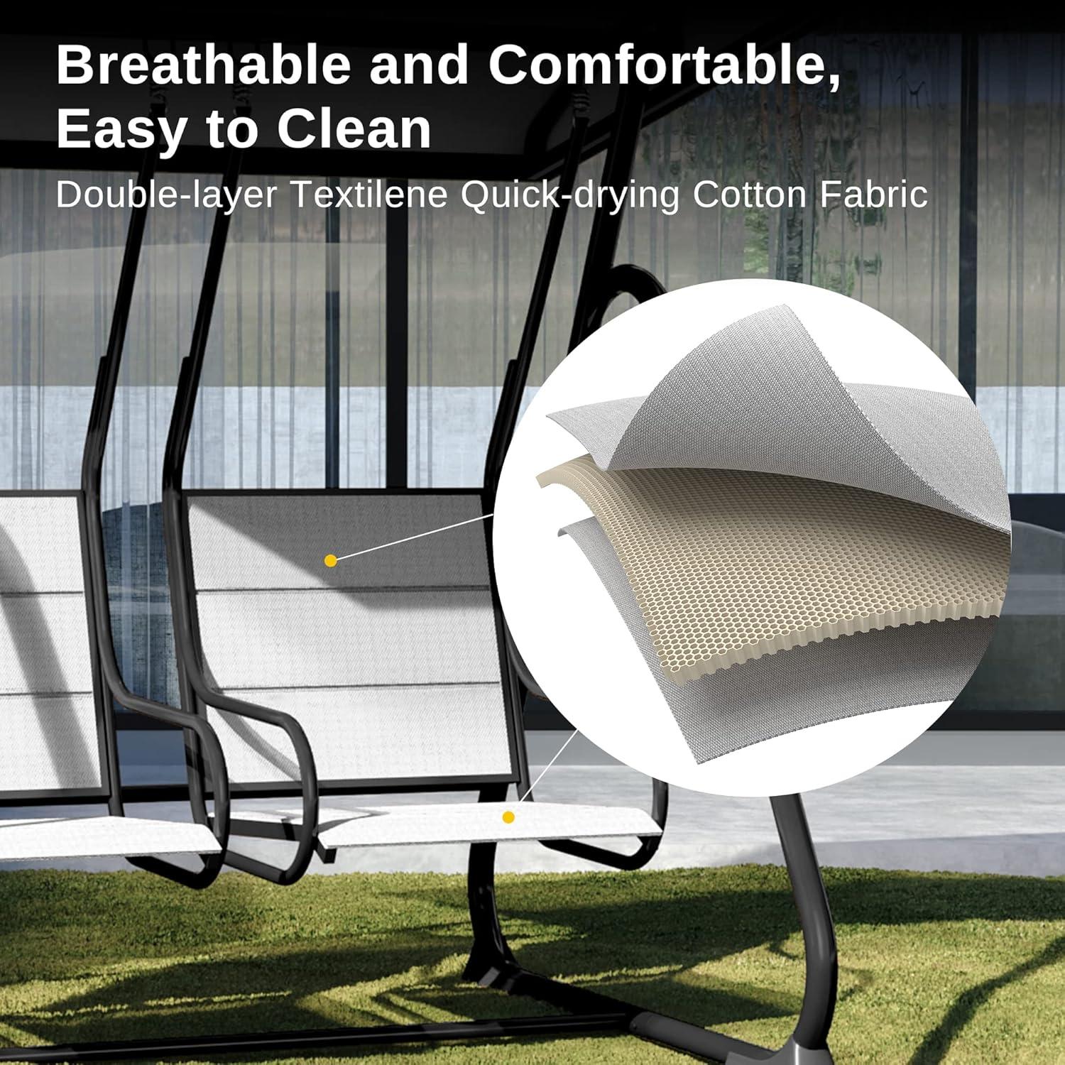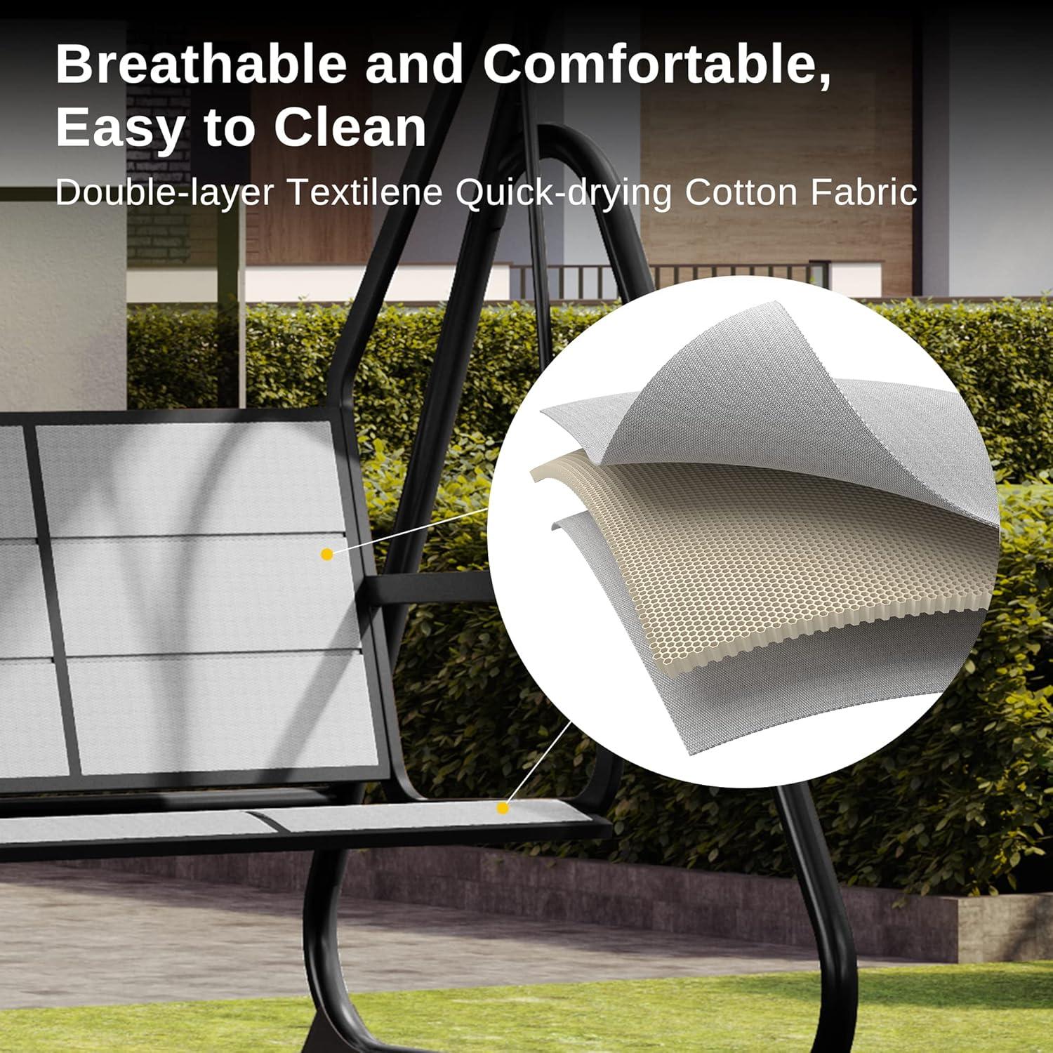 Breathable and Comfortable Seats: Double-layer Textilene quick-drying cotton seats deliver air permeability, water permeability, and excellent weather resistance. Non-stuffy in hot weather, water-resistant cushions, and backrest offer superior comfort when sitting. The patio swing chair is easy to clean; just wipe it with a rag or sponge
