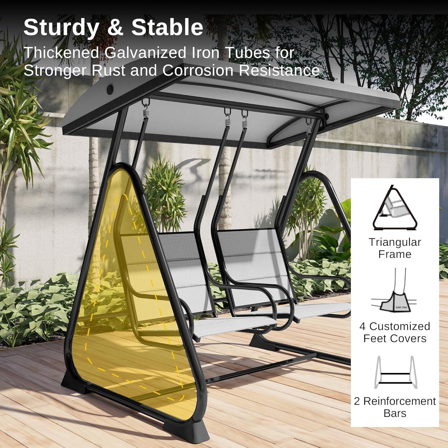 Stable and Durable Structure: The porch swing has double-layered thickened metal tubes, a triangular frame with powder coating and electrophoretic treatment to deliver corrosion and rust resistance. Equipped with four anti-slip foot pads, the outdoor swing is versatile for use in wet and dry weather. Furthermore, the foot pads also protect underlying surfaces from scratches