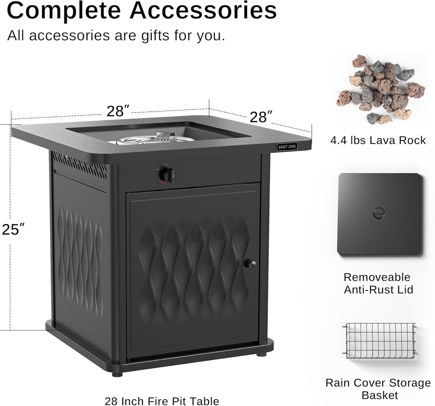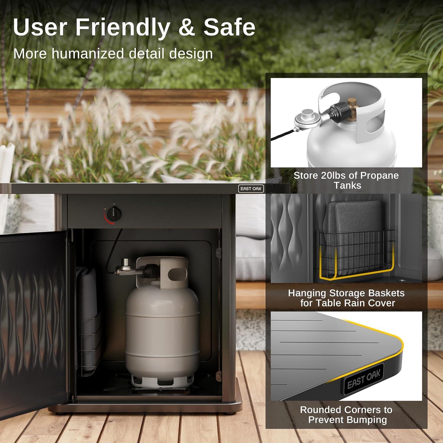 Hidden Storage Design: The outdoor fire tables body is a hidden storage design, which can be used for 20-lb propane tanks and table rain cover. EAST OAK firepit table has a special place on the side panels to hang storage basket and will provides a storage basket for free.