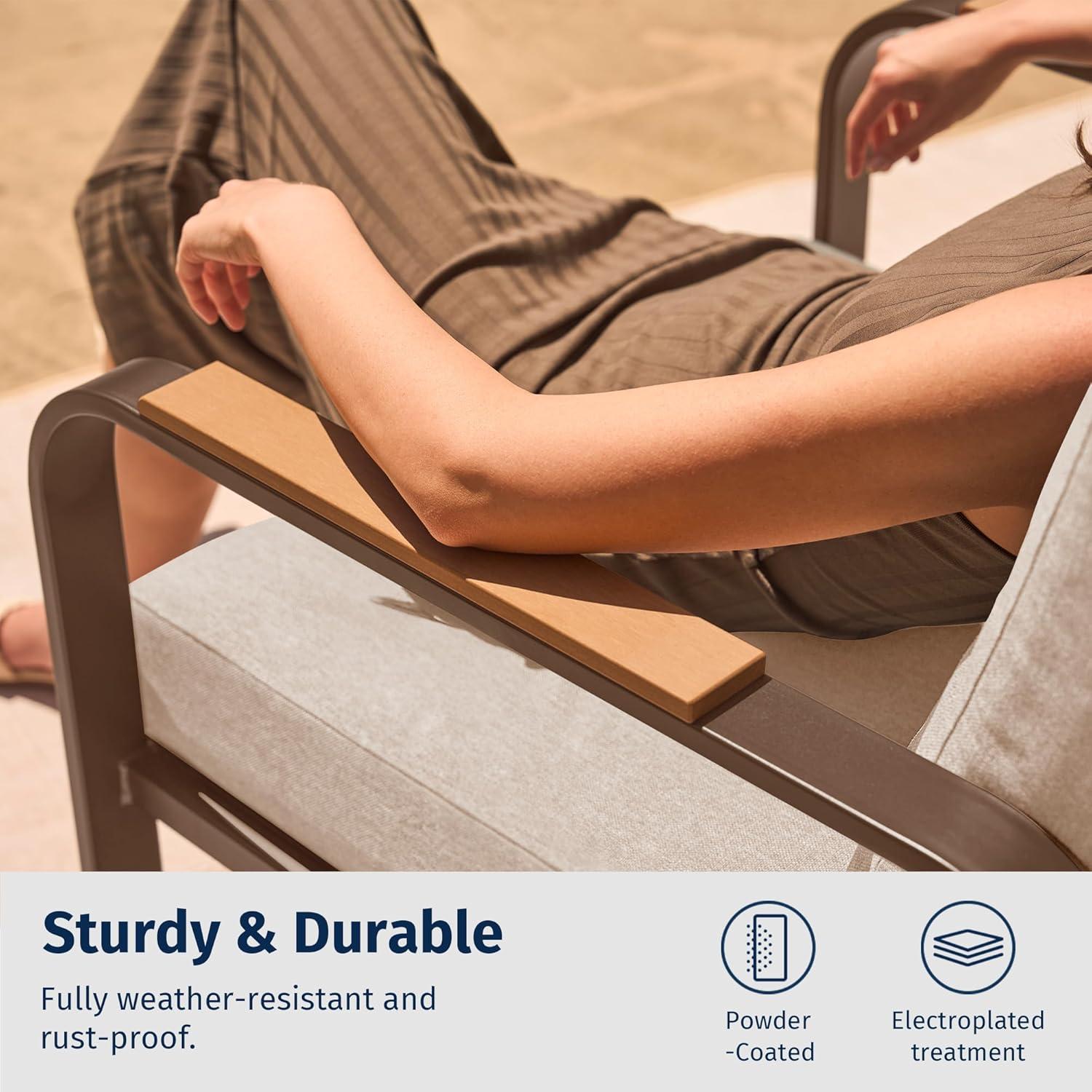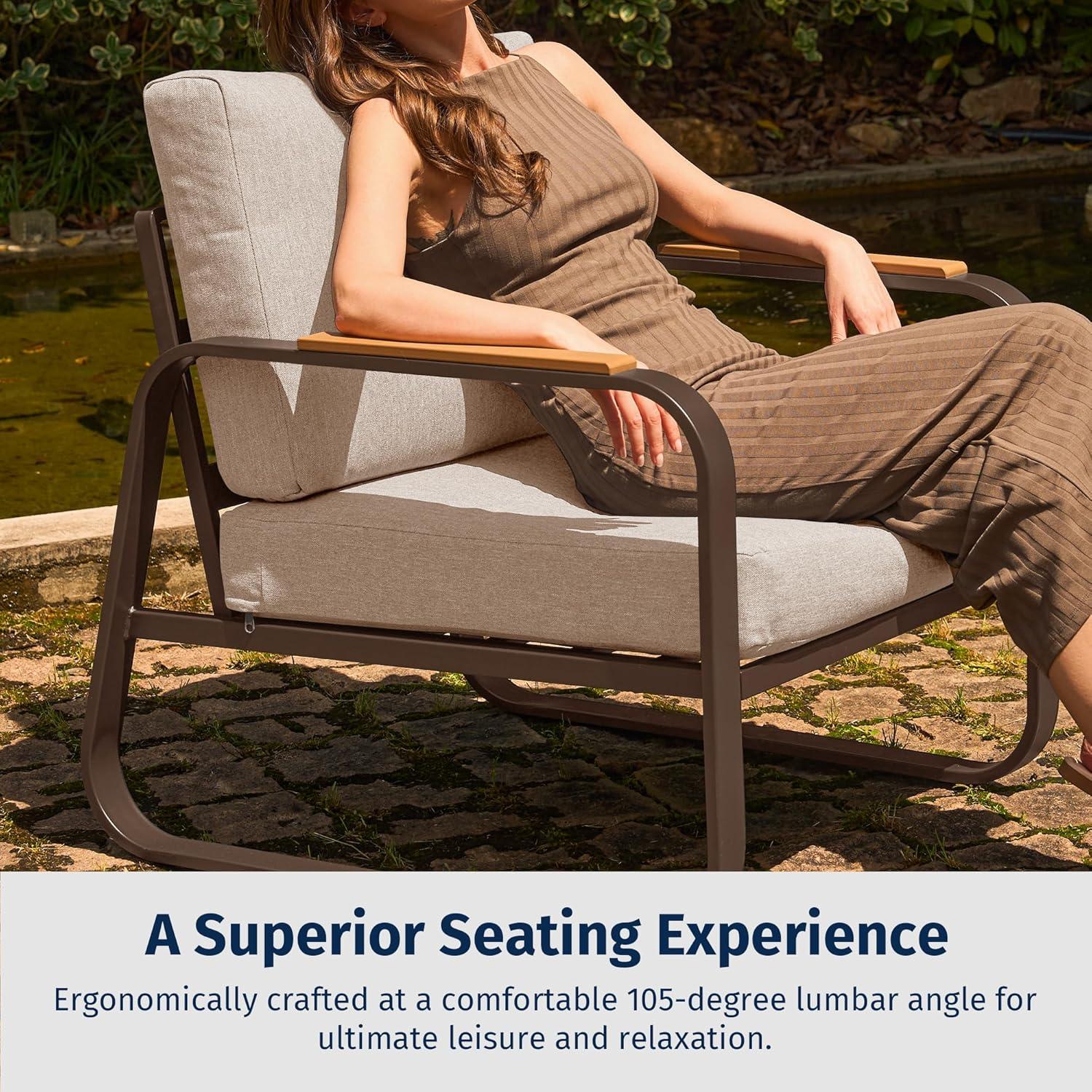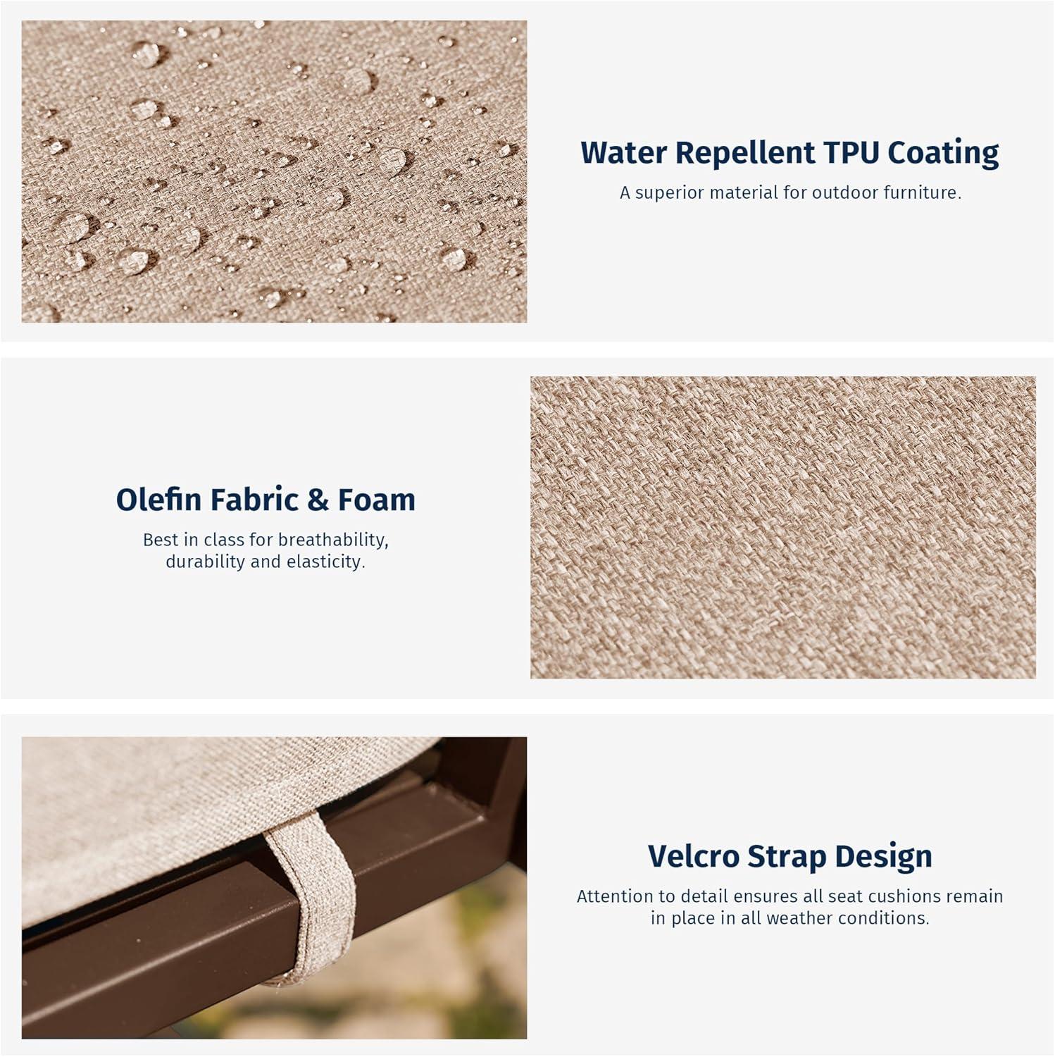 4.7″ Cushions for Ultimate Comfort: The seat cushion is meticulously crafted using TPU-Olefin fabric, renowned for its exceptional water-repellent capability, effortlessly taking on outdoor challenges. Paired with a 4.7-inch thick, multi-layered sponge and cotton filling, it provides optimal support and ultimate comfort. What's more, the cushion is removable to facilitate easy cleaning