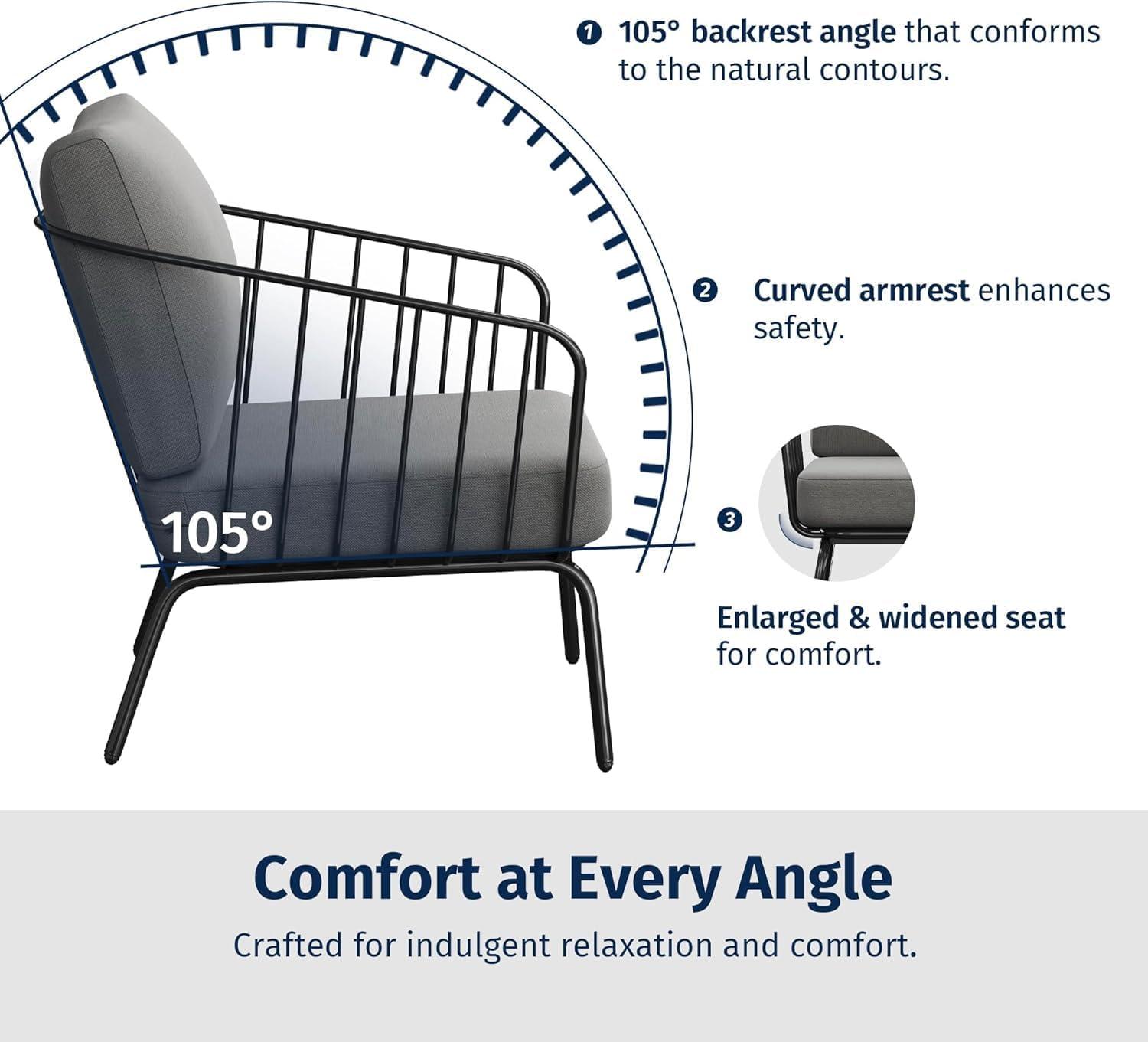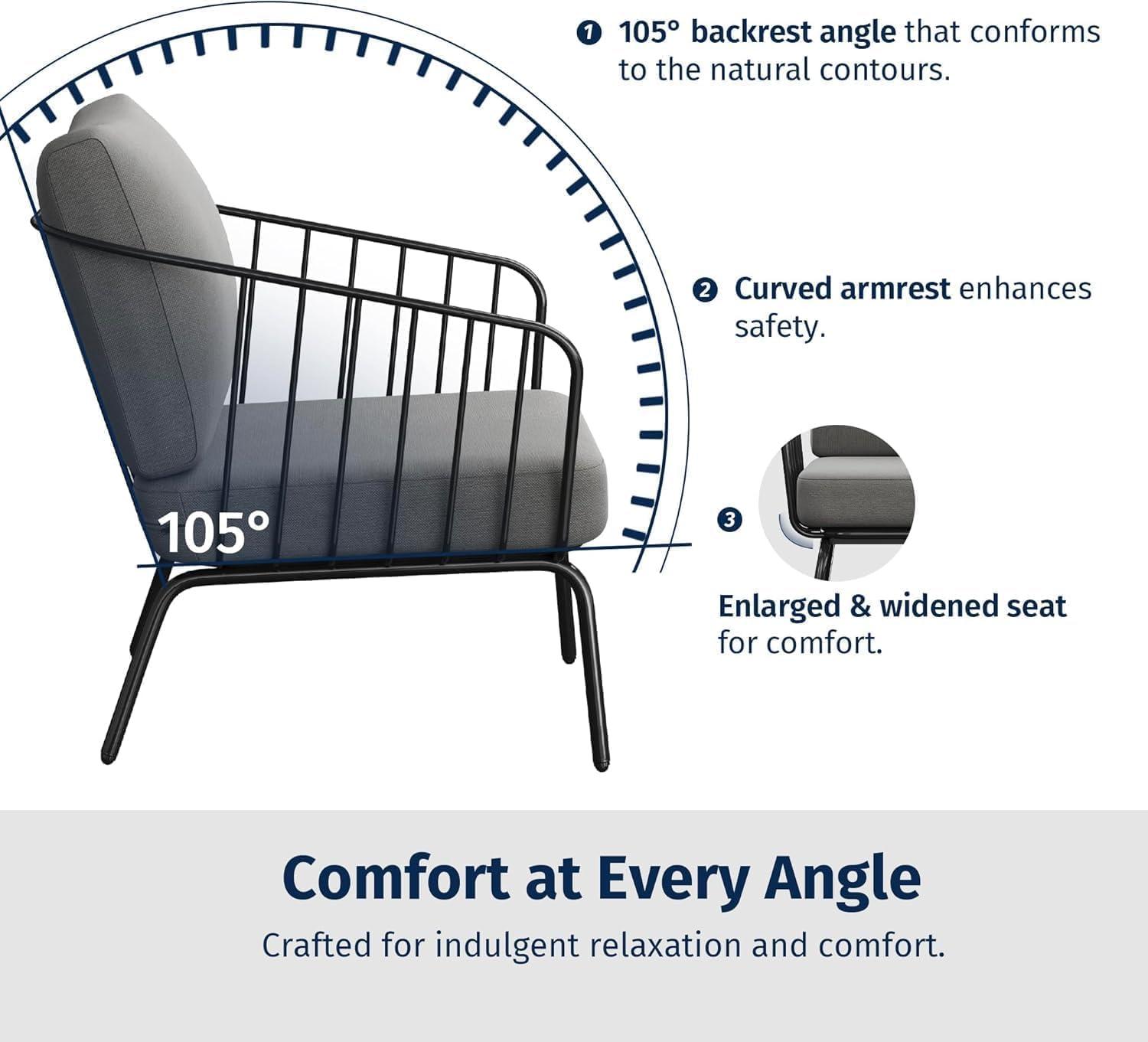 Sturdy and Durable: Our furniture set features a powder-coated metal frame that resists rust and weather. The armrests have soft edges for safety and comfort. Each seat can support up to 330 lbs, providing strength and reliability for years to come