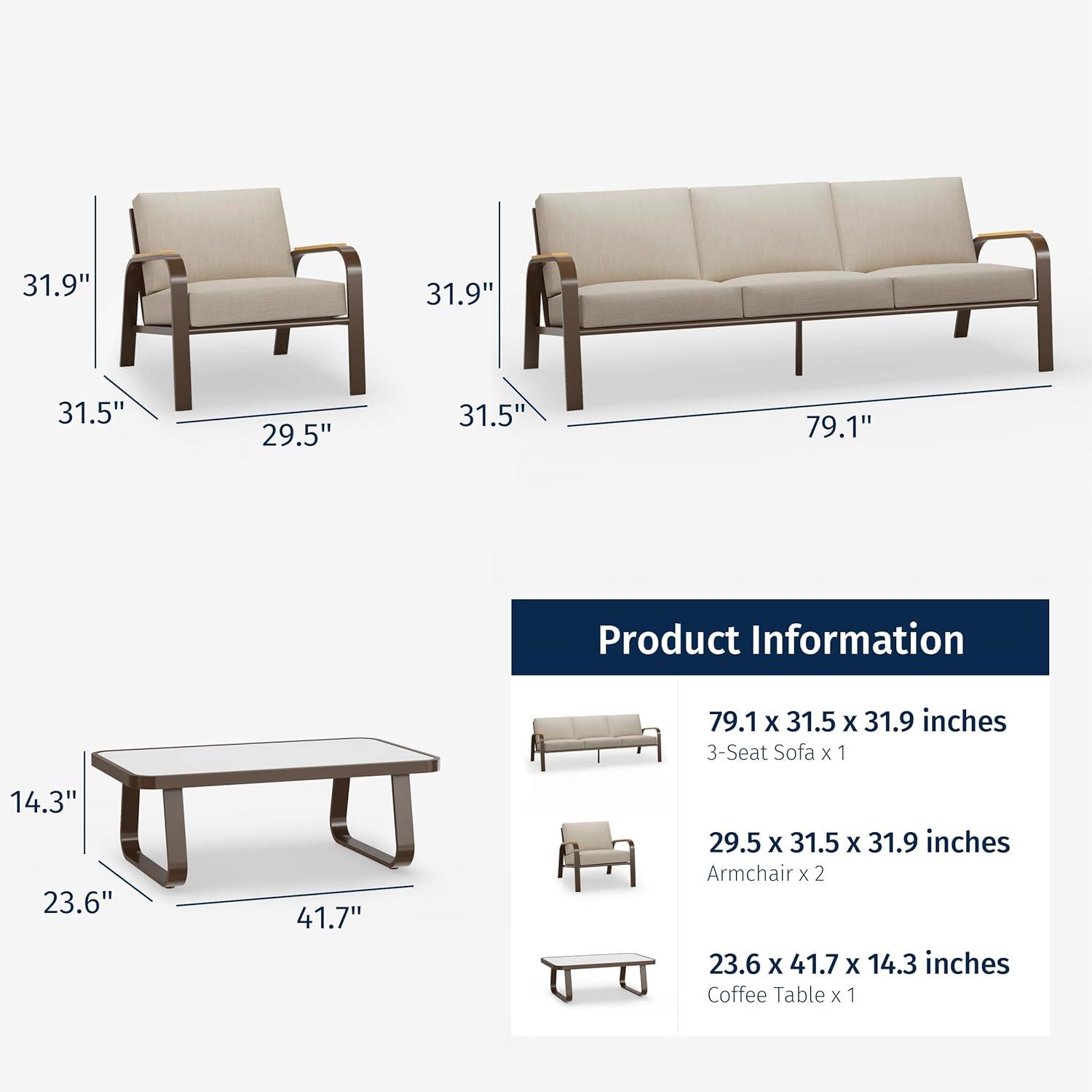 Quick and Easy Setup: The complete patio sofa set can be installed in about 20 minutes with just 2 people, making it a hassle-free experience. The Armchair can support up to 350 lbs, while the 3-seat sofa can bear a load of up to 1000 lbs. The set fits in almost any space: 3-Seat Sofa: 79.1 x 31.5 x 31.9 inches. Armchair: 29.5 x 31.5 x 31.9 inches. Coffee Table: 23.6 x 41.7 x 14.3 inches.