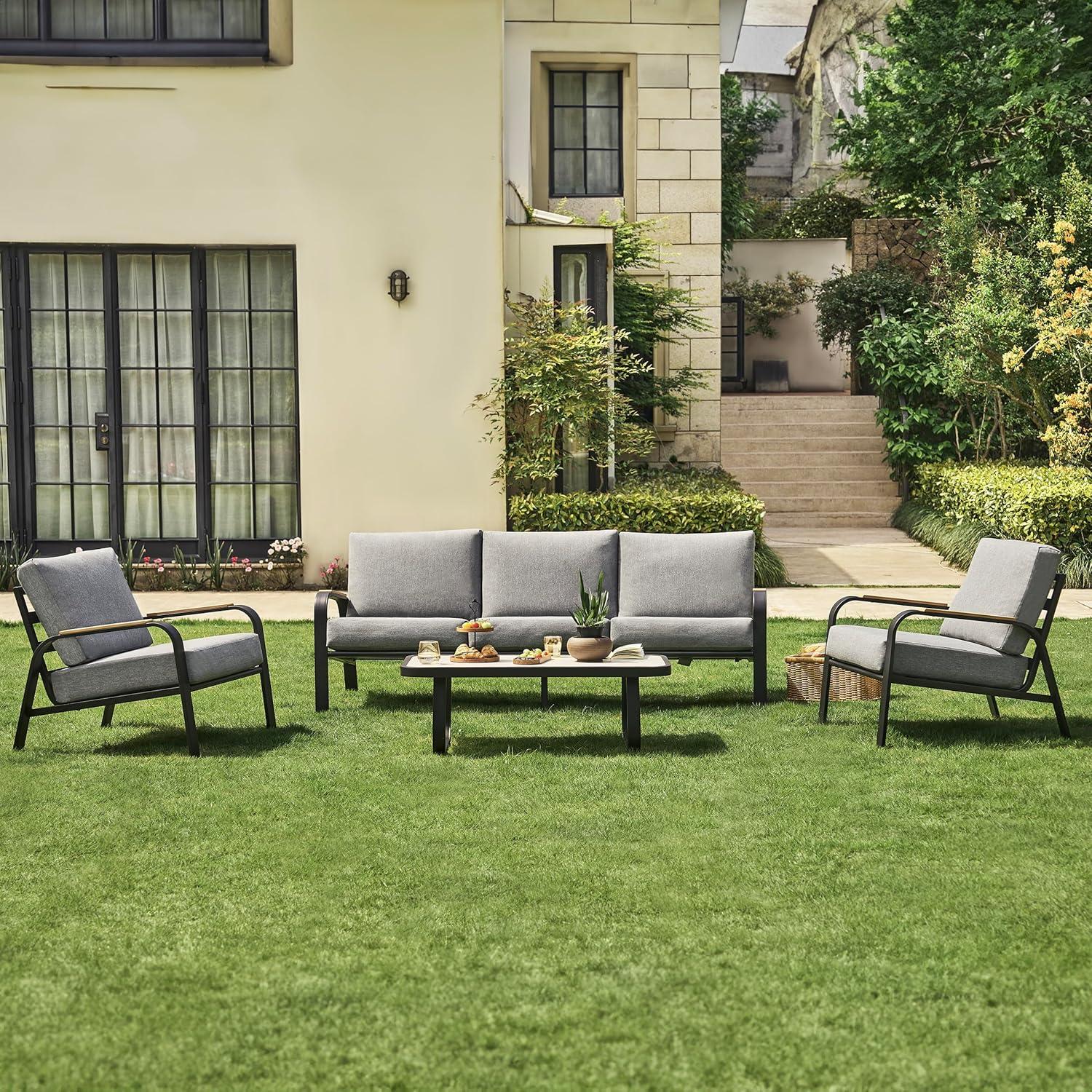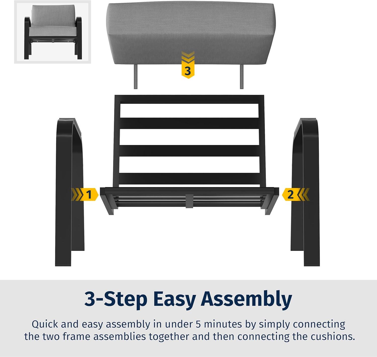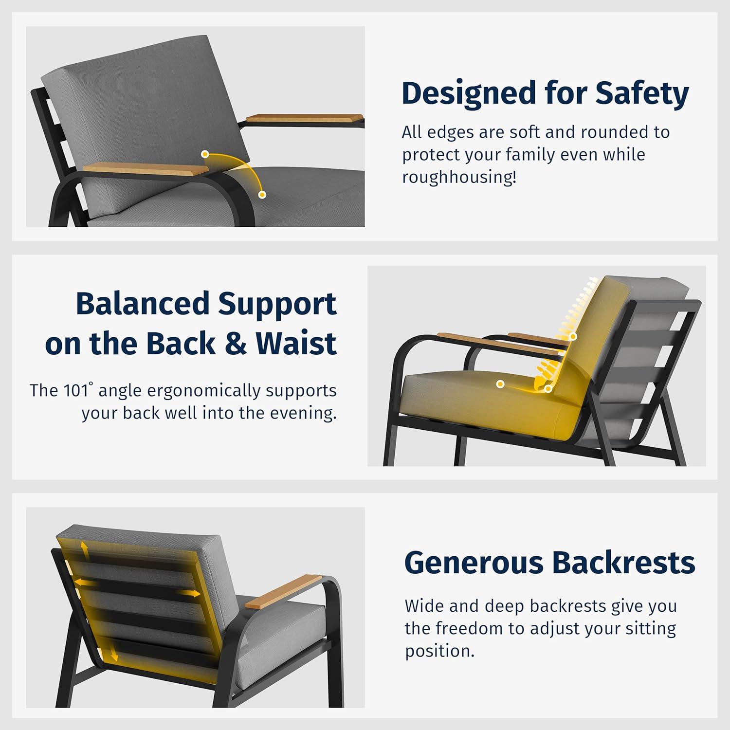 Upgraded Comfort: Designed for maximum comfort well into the evening, this patio furniture set features a high back and curved armrest. Its ergonomically designed 101° super-wide backrest and 2.3-inch wide armrest gently wrap around and support your body.