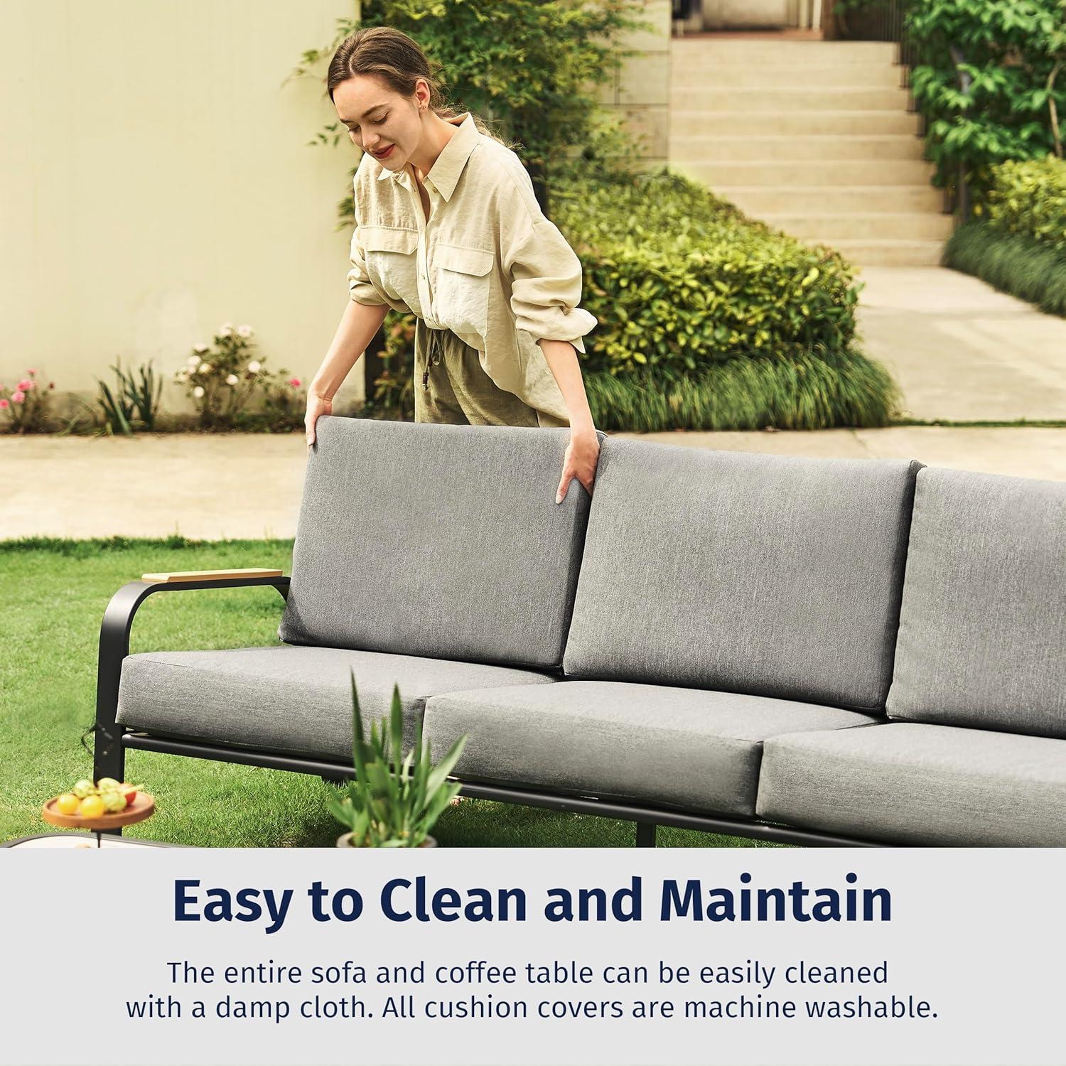 Quick and Easy Setup: The complete patio sofa set can be installed in about 20 minutes with just 2 people, making it a hassle-free experience. The Armchair can support up to 350 lbs, while the 3-seat sofa can bear a load of up to 1000 lbs. The set fits in almost any space: 3-Seat Sofa: 79.1 x 31.5 x 31.9 inches. Armchair: 29.5 x 31.5 x 31.9 inches. Coffee Table: 23.6 x 41.7 x 14.3 inches.