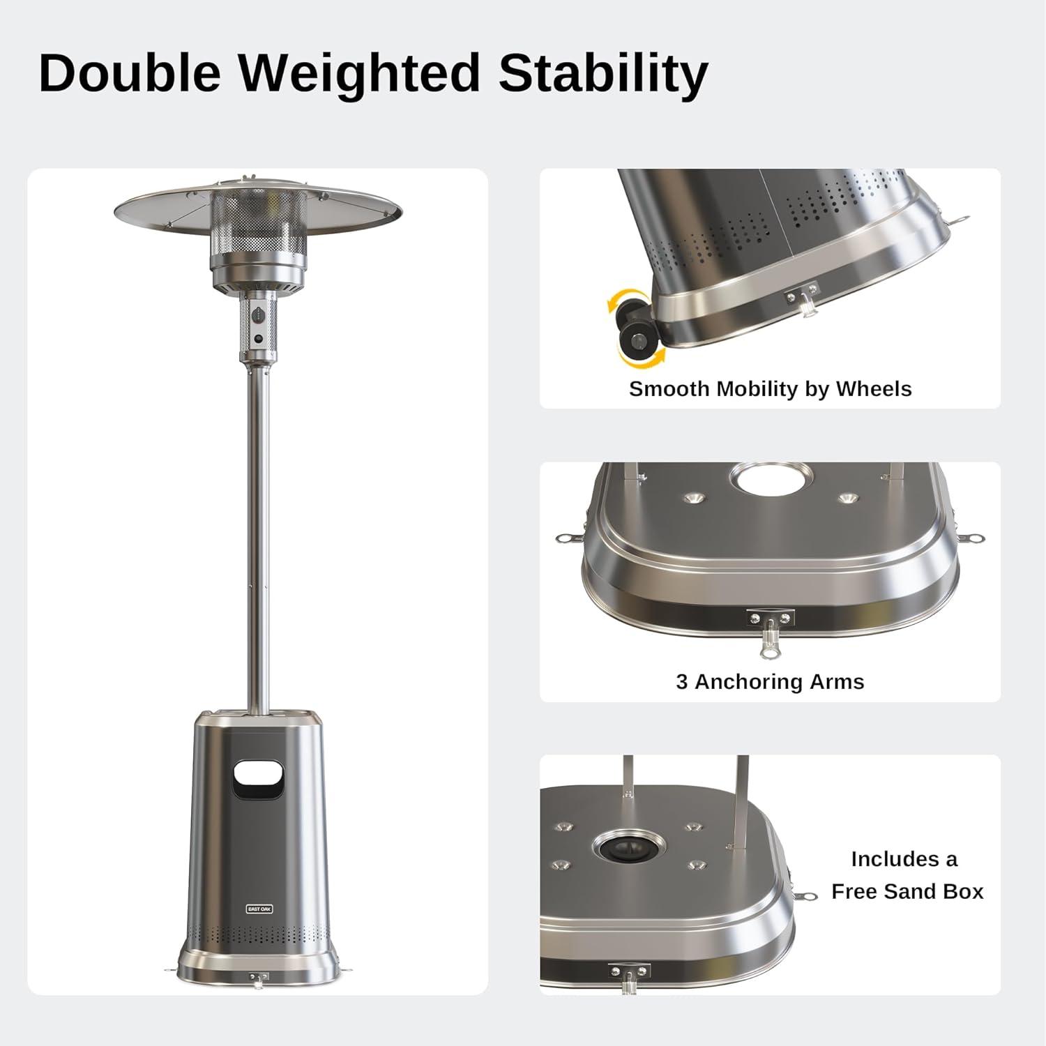 EAST OAK 50,000 BTU Patio Heater with Sand Box, Table Design, Double-Layer Stainless Steel Burner, Wheels, Triple Protection System, Outdoor Heater for Home and Residential, Pinecone(Stainless steel)