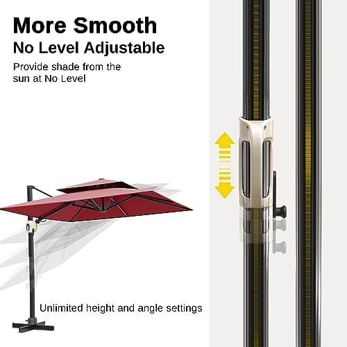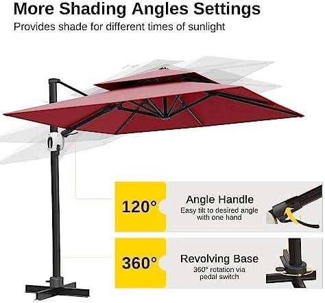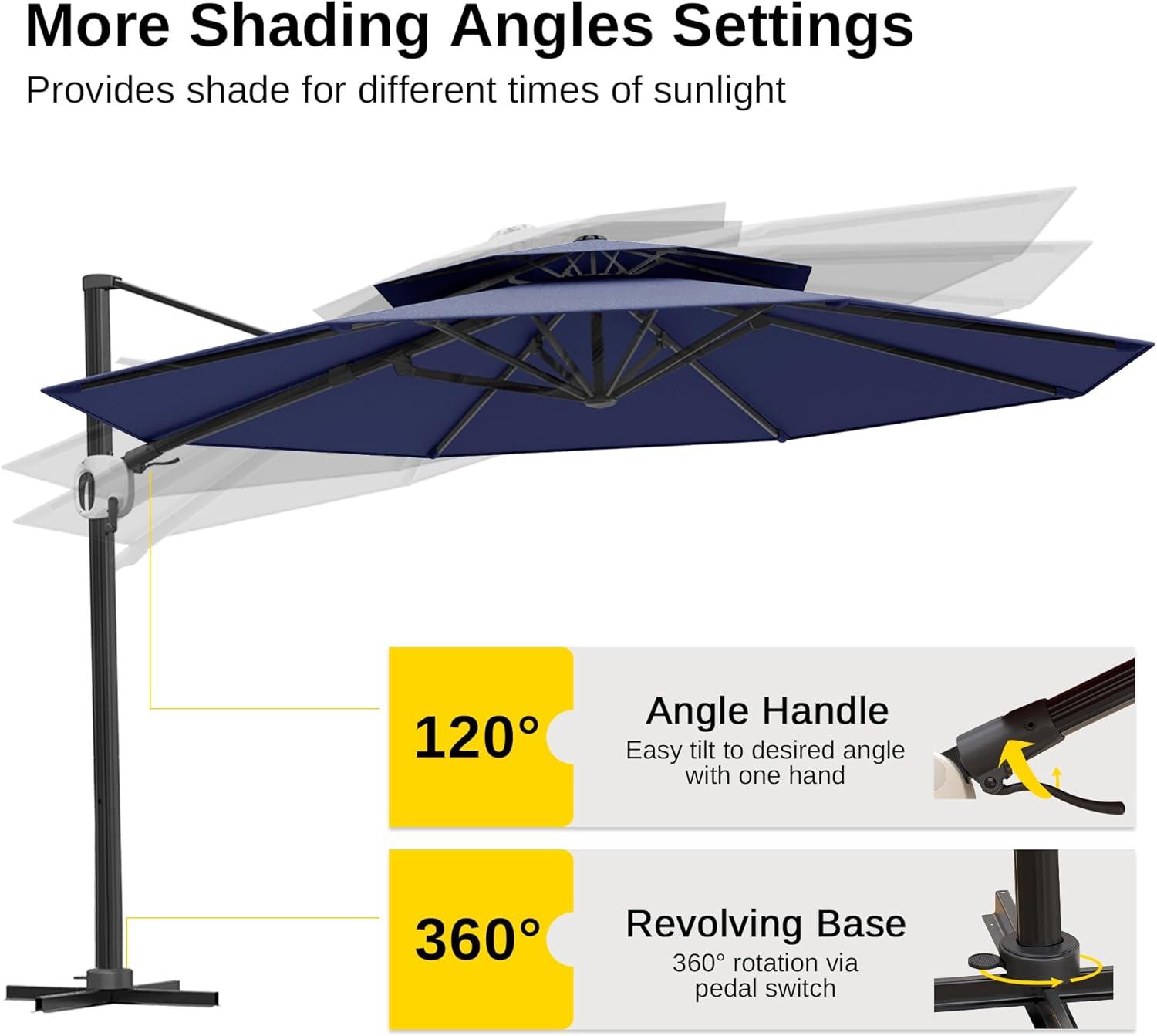 𝗠𝘂𝗹𝘁𝗶-𝗮𝗻𝗴𝗹𝗲 𝗦𝗵𝗮𝗱𝗲: With the upgraded stepless adjustment snap structure design, you can effortlessly make any up-and-down angle selection. Combined with the 360-degree rotating footrest and a 120-degree three-sided angle adjustment structure, the offset patio umbrella makes it easy to provide multi-angle shade