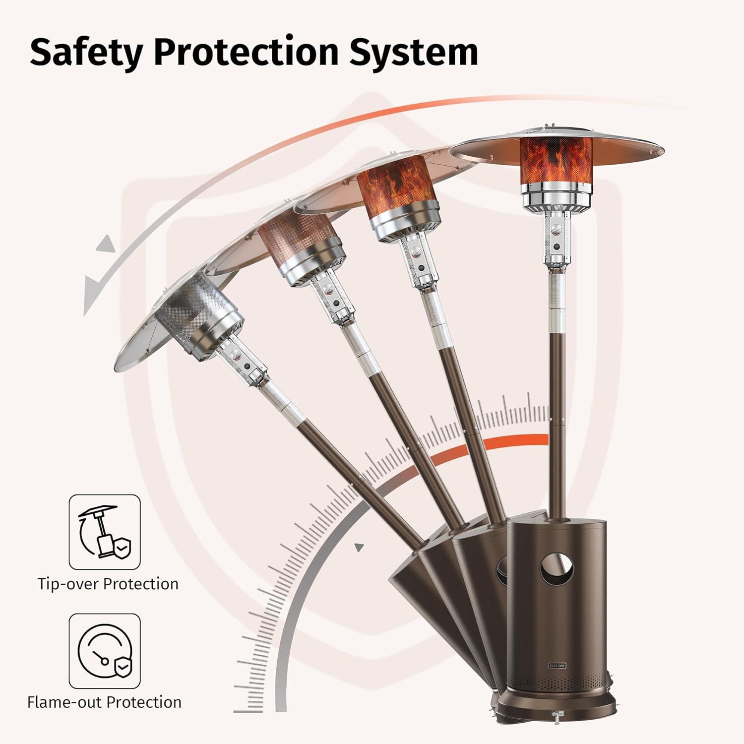 𝗣𝗼𝘄𝗲𝗿𝗳𝘂𝗹 𝟱𝟬,𝟬𝟬𝟬 𝗕𝗧𝗨 𝗛𝗲𝗮𝘁: Our outdoor patio heater delivers 50,000 BTU of power to spread heat up to an 20-foot diameter from its central heating position. With ETL certification, it is ideal for outdoor and commercial use and can be placed on an outdoor balcony, garden, swimming pool, etc