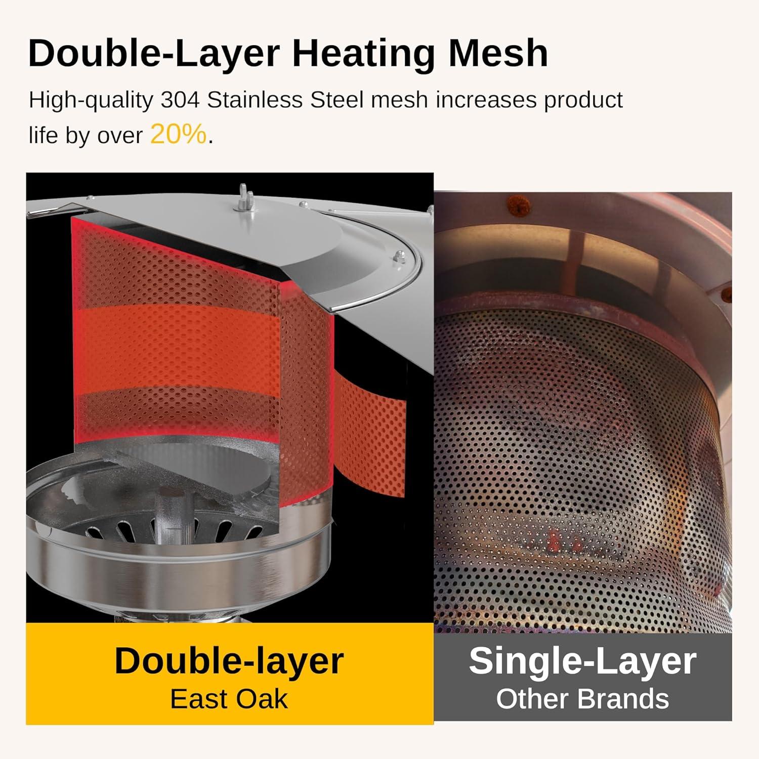 𝗠𝗼𝗿𝗲 𝗗𝘂𝗿𝗮𝗯𝗹𝗲 𝗗𝗼𝘂𝗯𝗹𝗲-L𝗮𝘆𝗲𝗿 𝗛𝗲𝗮𝘁𝗶𝗻𝗴 𝗠𝗲𝘀𝗵: High-quality 304 stainless steel is engineered into our double-cover heating mesh design. Compared with a traditional single-layer burning mesh heater, the EAST OAK Outdoor Heater is more powerful, durable, and safer. All these improvements deliver a 30% longer product life