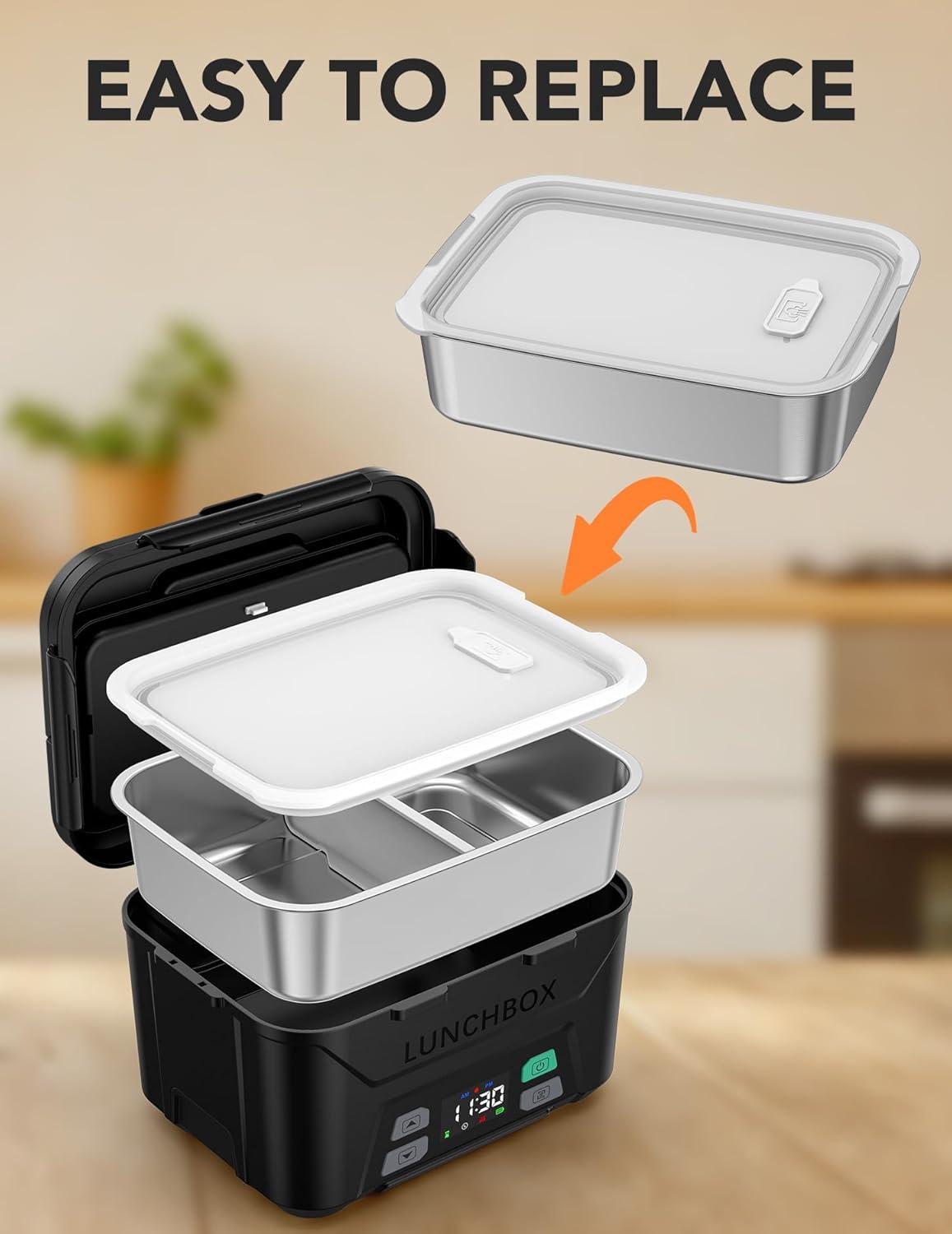 Smart Timer Function: The heated lunch box for men includes a smart timer for setting your mealtime. It automatically heats your food in advance, ensuring a hot meal when you’re ready. The memory function remembers your last settings, so no adjustments are needed each time