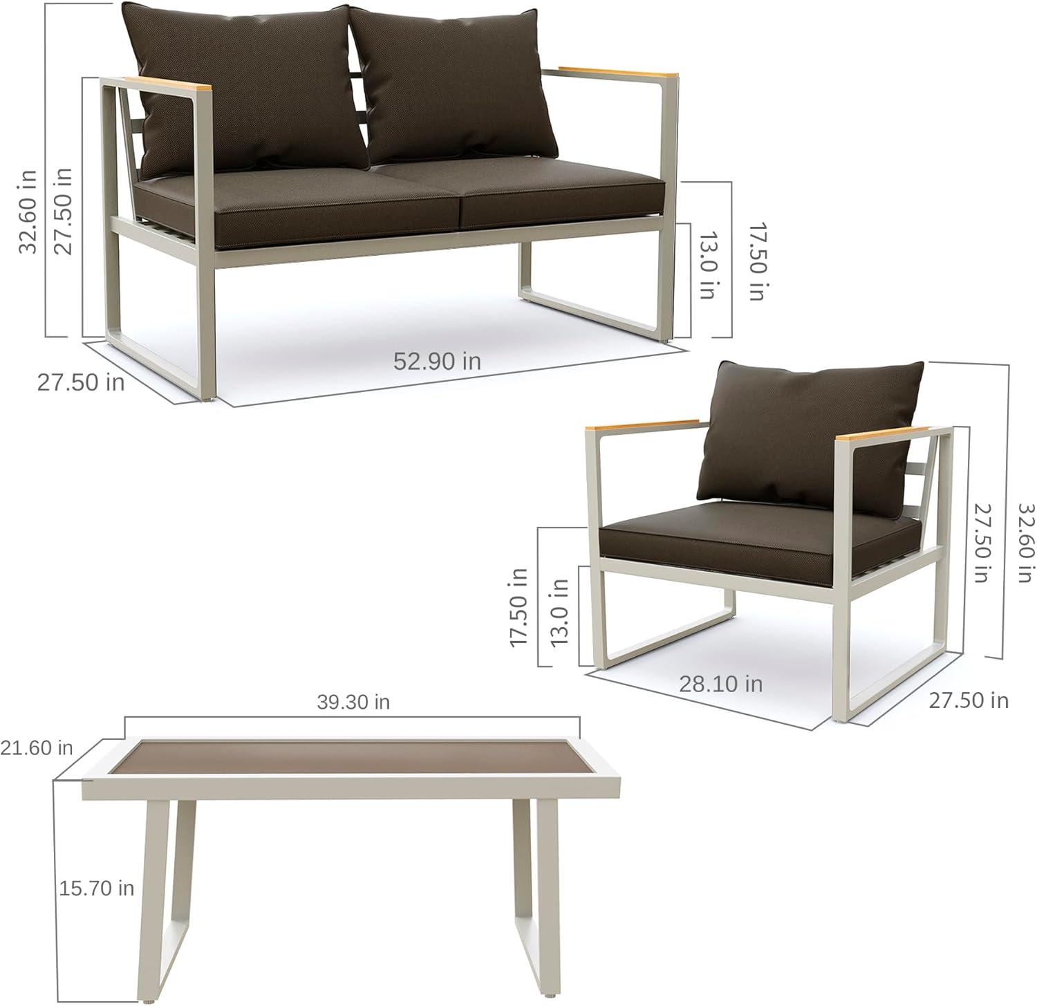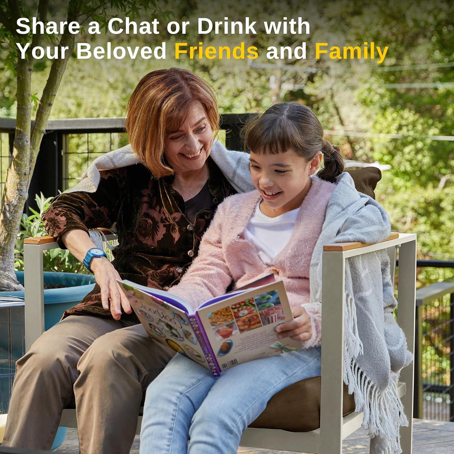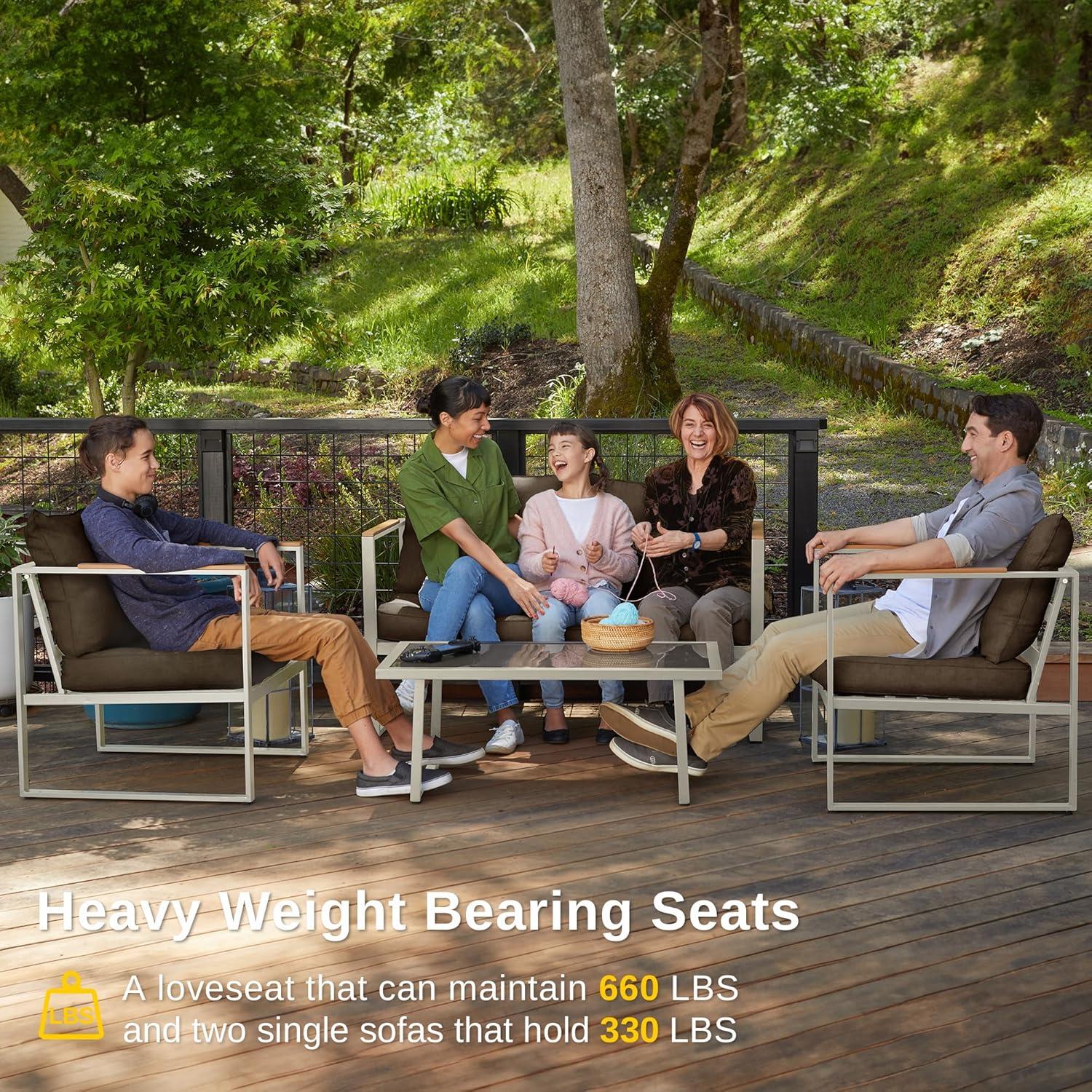 LARGE CARRYING CAPACITY: Our outdoor patio furniture set is incredibly strong and features a loveseat that can support up to 660 lbs and an armchair that can support up to 330 lbs. Each seat is made of E-coated premium metal to protect against rust or scratches. The set is designed to withstand all weather conditions (the entire set arrives in one box)