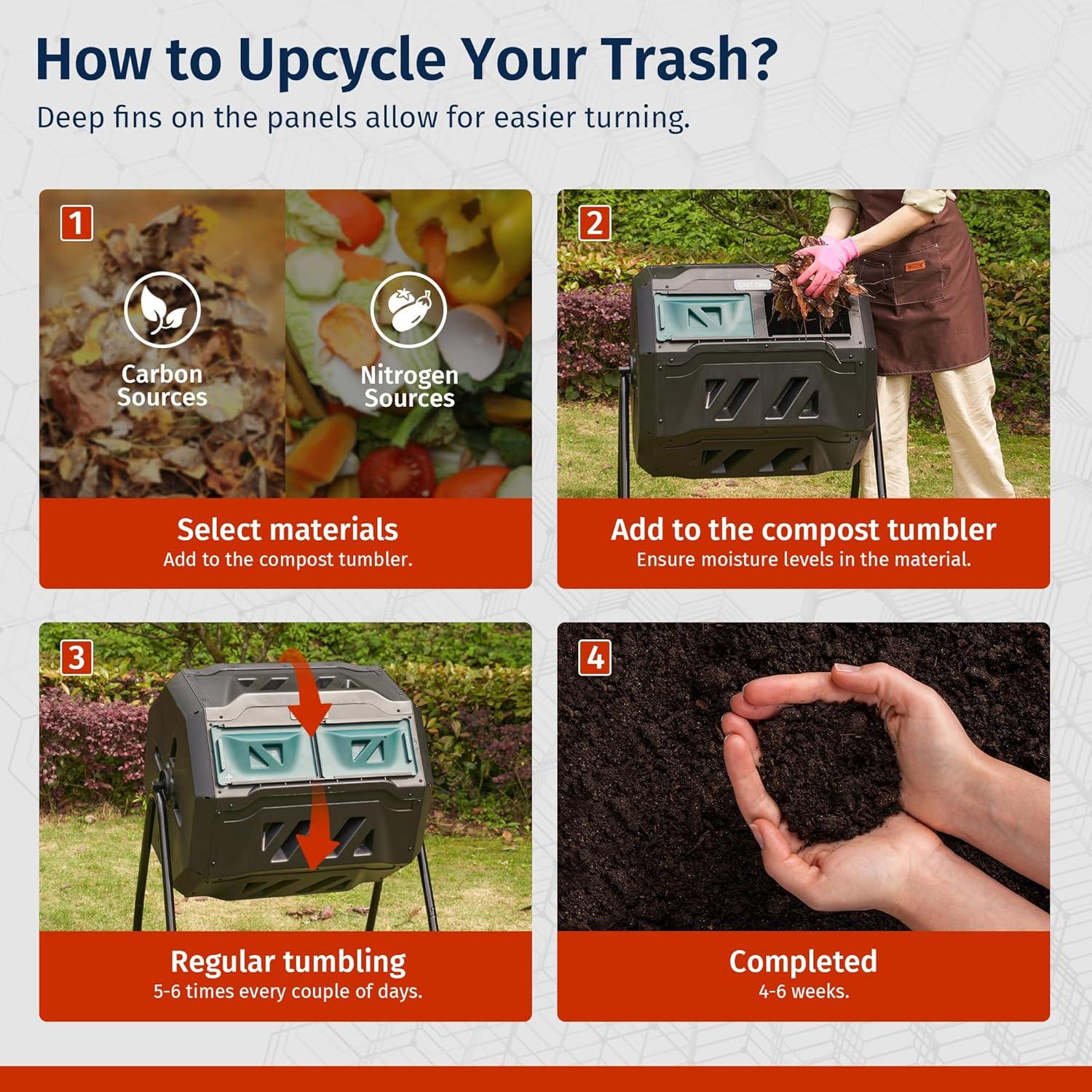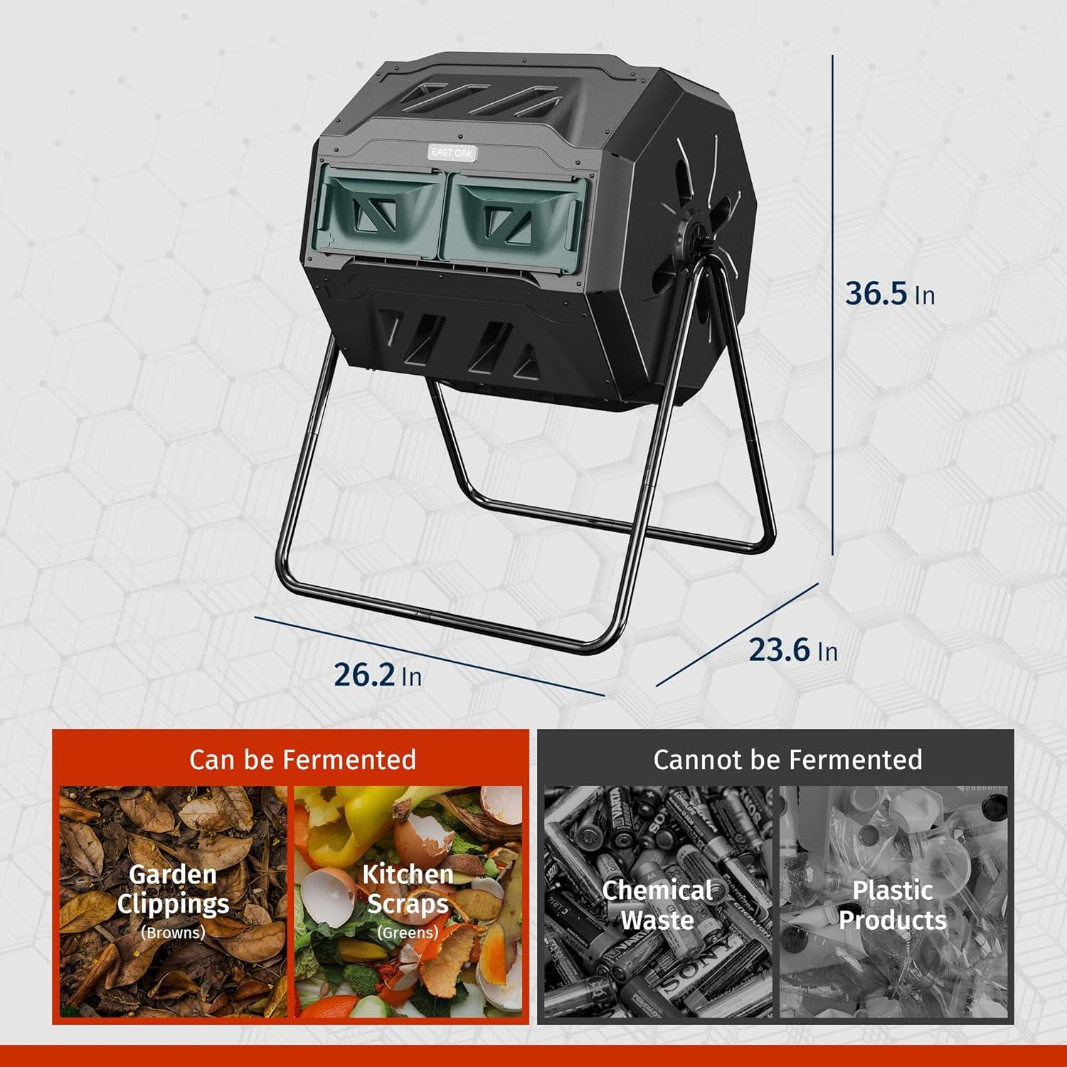 【Practical Dual Chamber Design】2 × 18.5 Gallon separate chambers are alternate for FAST and EFFICIENT composting. Allowing one side to complete the composting process while the other side receives fresh scraps/clippings. This constant alternation ensures that your garden receives a constant supply of nutritious compost.