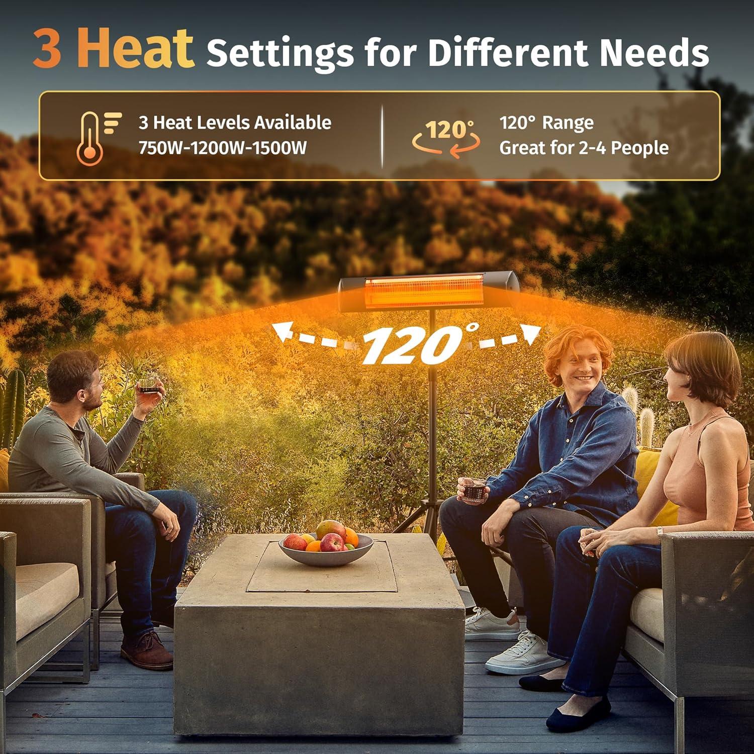 3 Adjustable Heat Levels: Customize your comfort with three heat settings (750W, 1200W, 1500W). Whether you need gentle warmth on cool evenings or powerful heat in winter, this infrared heater adapts to your comfort needs.