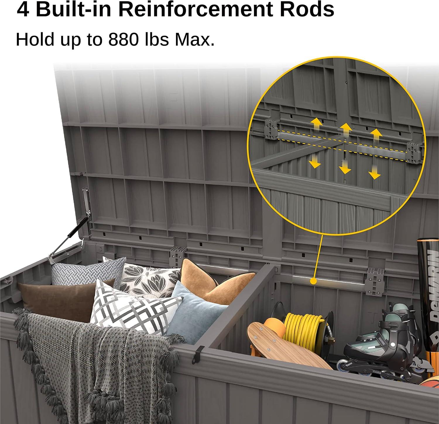𝗟𝗢𝗡𝗚 𝗟𝗔𝗦𝗧𝗜𝗡𝗚 𝗦𝗘𝗥𝗩𝗜𝗖𝗘 𝗟𝗜𝗙𝗘: With weather-resistant resin, the deck box prevents rusting, peeling and denting, lasting longer than wood. 4 built-in reinforcing rods can prevent deformation after being exposed to the sun