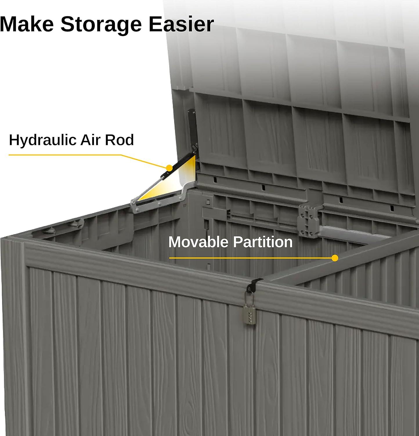 𝗦𝗔𝗙𝗘 𝗔𝗡𝗗 𝗜𝗡𝗝𝗨𝗥𝗬-𝗙𝗥𝗘𝗘: Our outside storage box is equipped with hydraulic lever design to ensure safe operation without the risk of pinching your hands. The box is also equipped with a detachable partition inside, so you can store items in sections