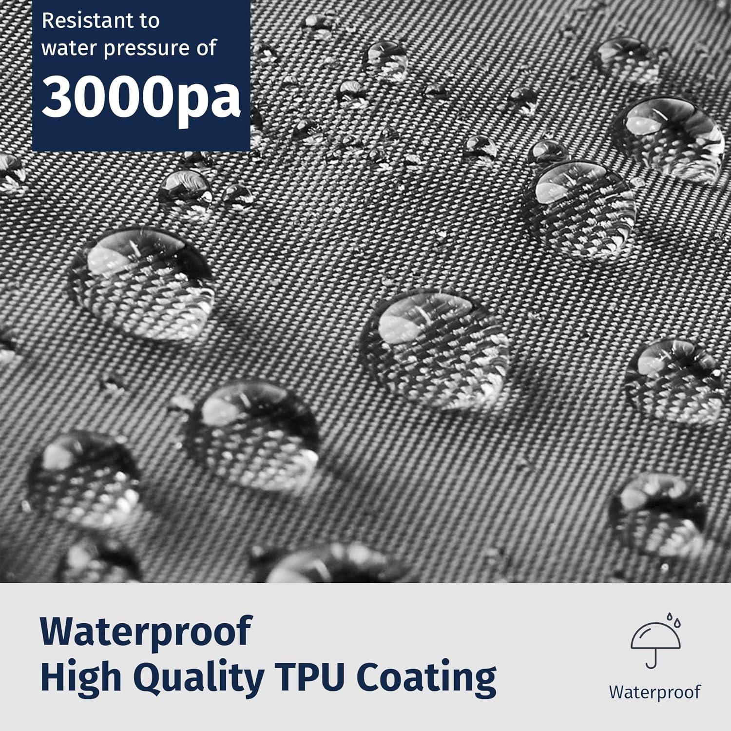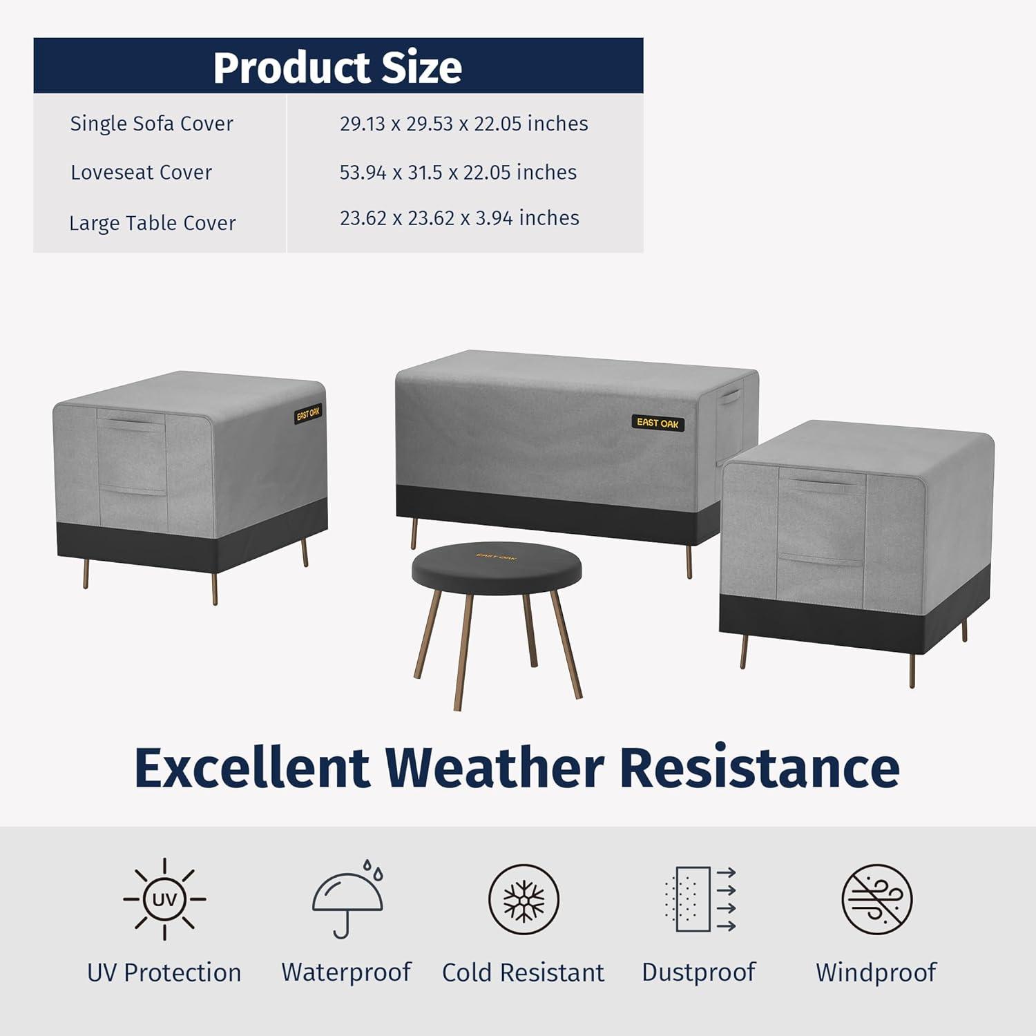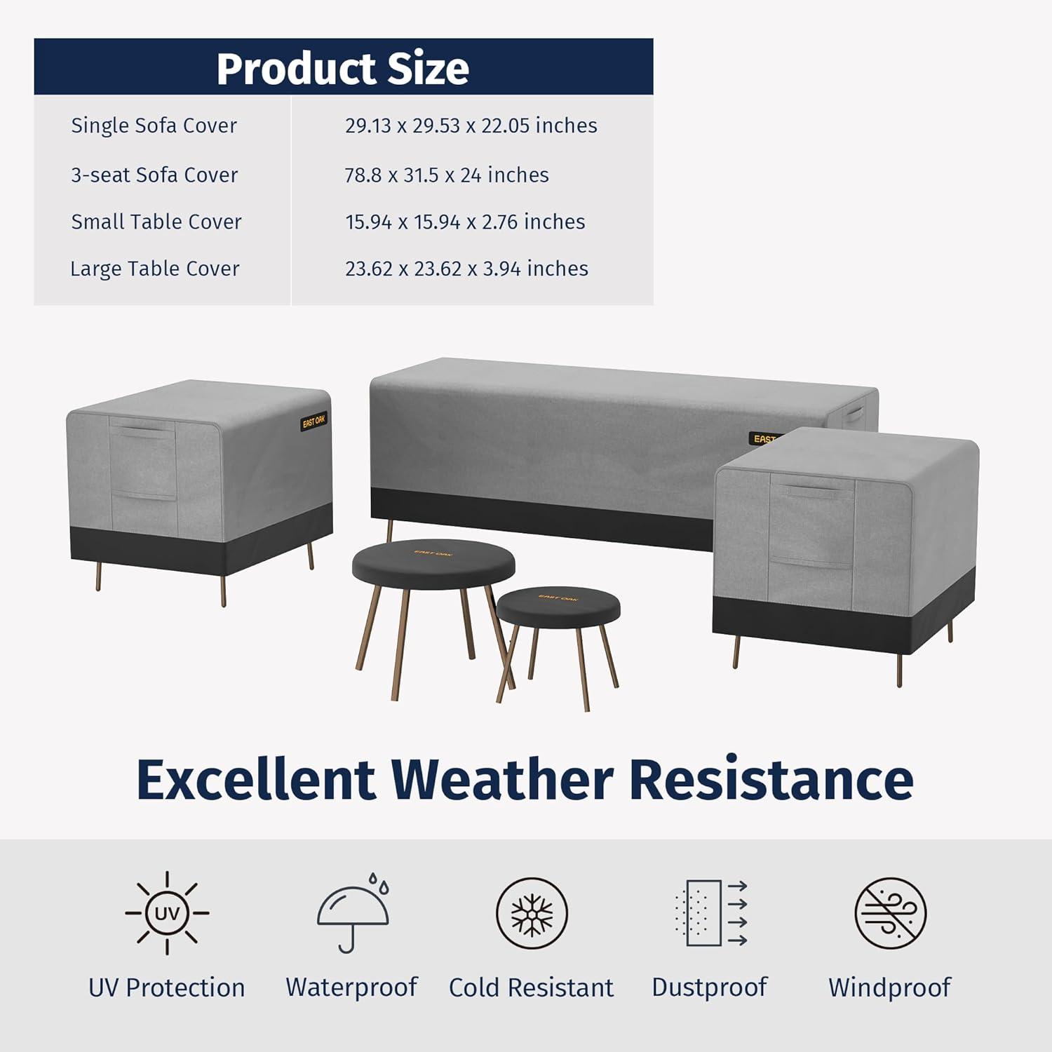Superior TPU Waterproof Outdoor Cover: The EAST OAK outdoor furniture cover is crafted from durable 600D fabric, ensuring water beads up and rolls off effortlessly. The interior is reinforced with a high-grade waterproof TPU coating and pressure-glued seam tape, guaranteeing zero water leakage. This superior design keeps your patio furniture dry, even during heavy rain