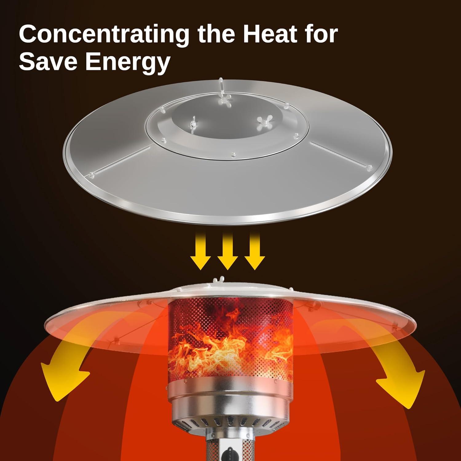 𝗛𝗶𝗴𝗵𝗹𝘆 𝗥𝗲𝗳𝗹𝗲𝗰𝘁𝗶𝘃𝗲 𝗧𝗵𝗲𝗿𝗺𝗮𝗹 𝗘𝗳𝗳𝗶𝗰𝗶𝗲𝗻𝗰𝘆 : With a 33″ diameter, this heater reflector shield offers extensive coverage and superior reflective thermal efficiency, while saving more propane energy. Efficiently collects and distributes heat, aiding in energy conservation