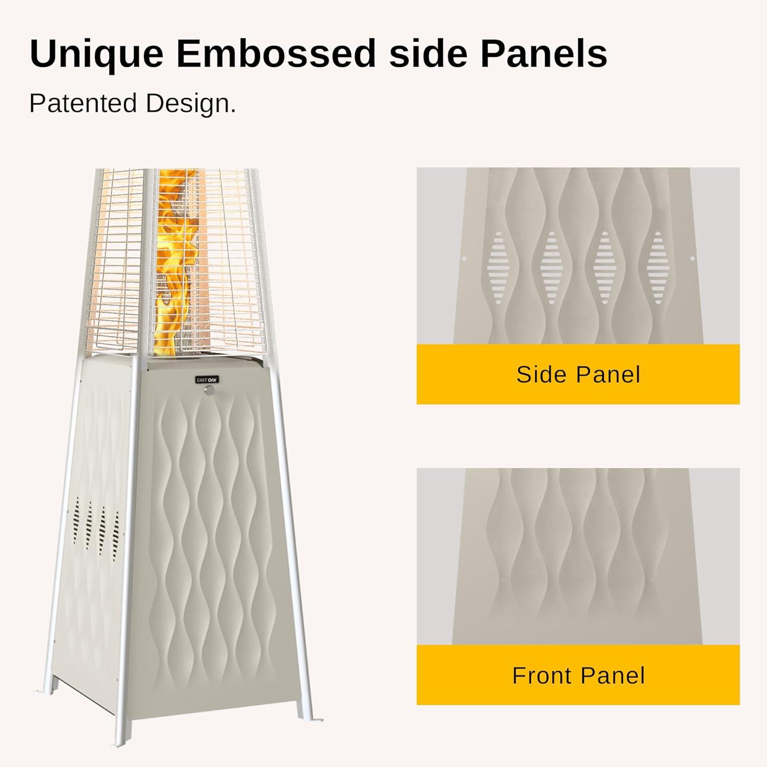 𝗨𝗻𝗶𝗾𝘂𝗲 𝗣𝗮𝘁𝗲𝗻𝘁𝗲𝗱 𝗘𝗺𝗯𝗼𝘀𝘀𝗲𝗱 𝗗𝗲𝘀𝗶𝗴𝗻: Our in-house design team put their hearts and souls into creating the EAST OAK Pyramid Patio Heater. Our goal was to create something that not only worked well but would also be the centerpiece of any outdoor entertaining area. The embossed stainless steel surfaces complement any decor with elegance, and the heater’s flame feature will be the talk of the neighborhood