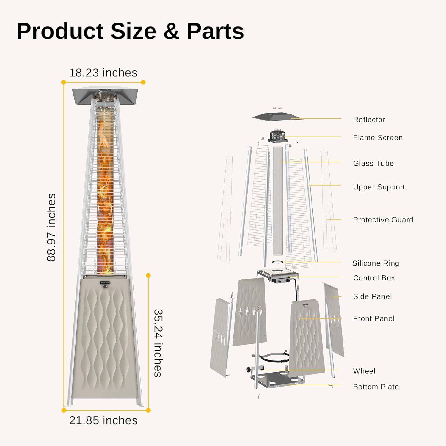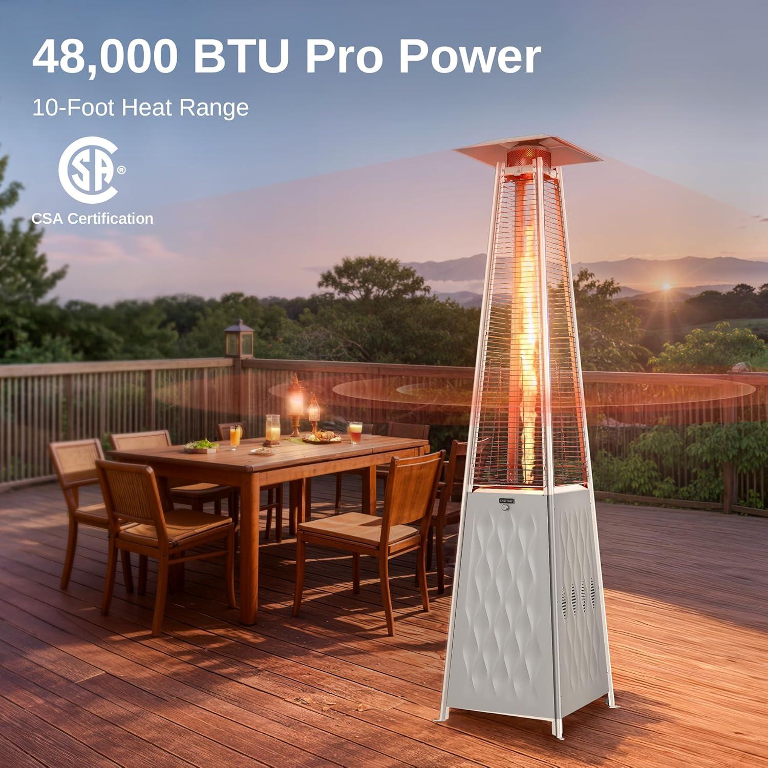 EAST OAK Pyramid Patio Heater, 48,000 BTU Outdoor Patio Heater All Stainless Steel, Quartz Glass Tube Propane Heater for Commercial & Residential, Triple Protection System, With Wheels, 2024 Upgrade(Champagne White)