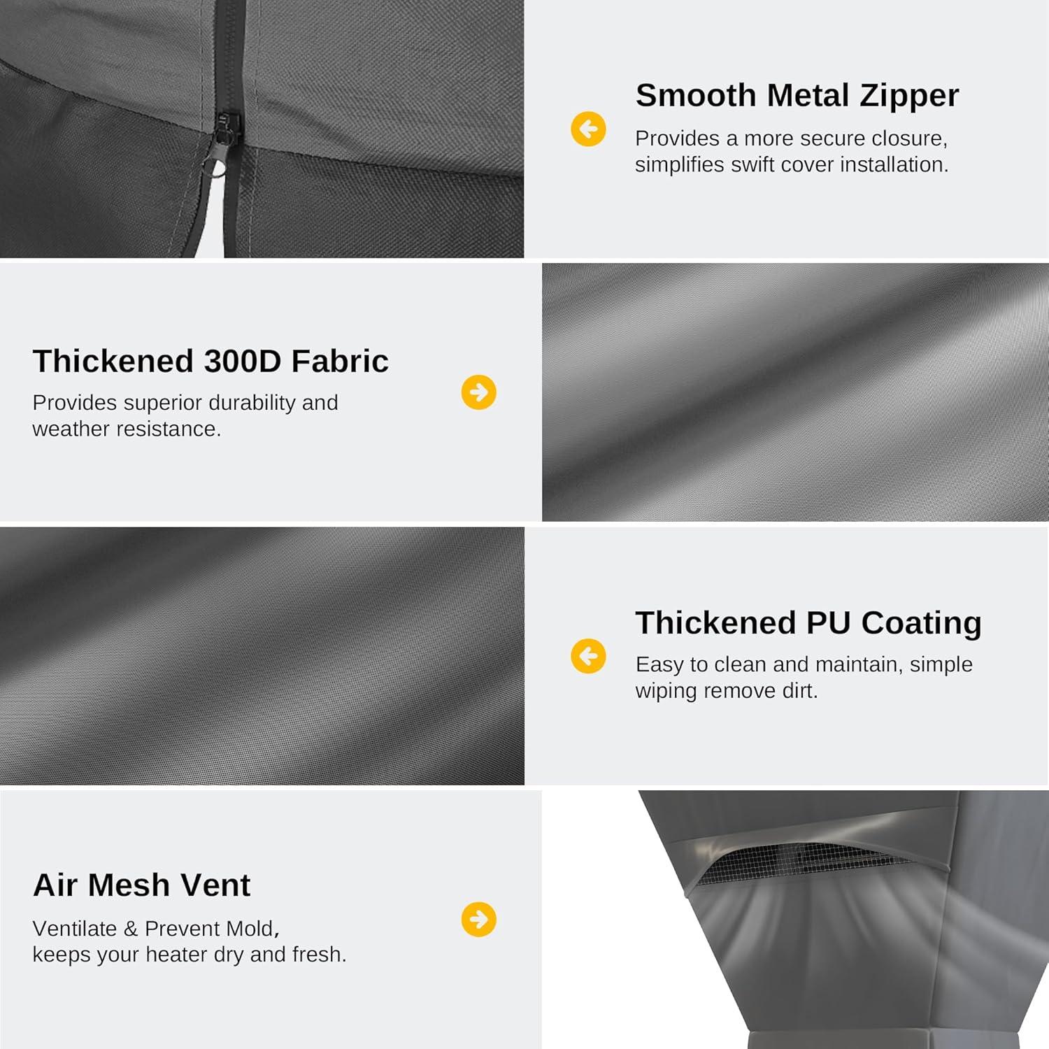 𝗗𝘂𝗿𝗮𝗯𝗹𝗲 𝟯𝟬𝟬𝗗 𝗢𝘅𝗳𝗼𝗿𝗱 𝗙𝗮𝗯𝗿𝗶𝗰: Outdoor patio heater covers are made of 300D Oxford cloth with PU coating and air mesh vent added, allowing them to withstand strong wind, heavy raining, and heavy snow, without cracking in the cold, and ensure a long time of usage.